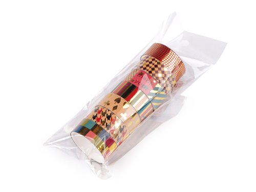 Sada lepicích pásek, které jsou ozdobené lesklými metalickými detaily. Využijete je na všech hladkých materiálech, jako je dřevo, plast, papír, sklo, atd. Můžete s nimi ozdobit dárky a krabičky či je nalepit na přáníčka, alba, foto rámečky, do diáře apod. Díky samolepicí vrstvě jsou velmi snadno použitelné, jsou pevné, nedají se trhat. Sada obsahuje 7 ks pásek s různým designem. Každý kotouček obsahuje cca 1,7 m pásky. Velké balení 24 ks pásek je zabalené v papírové krabičce s transparentním víkem. Krabička má rozměry 12 x 16,5 x 4 cm.