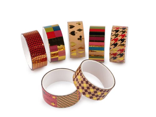 Sada lepicích pásek, které jsou ozdobené lesklými metalickými detaily. Využijete je na všech hladkých materiálech, jako je dřevo, plast, papír, sklo, atd. Můžete s nimi ozdobit dárky a krabičky či je nalepit na přáníčka, alba, fotorámečky, do diáře apod. Díky samolepicí vrstvě je velmi snadno použitelná, je pevná, nedá se trhat. Sada obsahuje 7 ks pásek s různým designem. Každý kotouček obsahuje cca 1,7 m pásky. Velké balení 24 ks pásek je zabalené v papírové krabičce s transparentním víkem. [Krabička má rozměry 12 x 16,5 x 4 cm.]