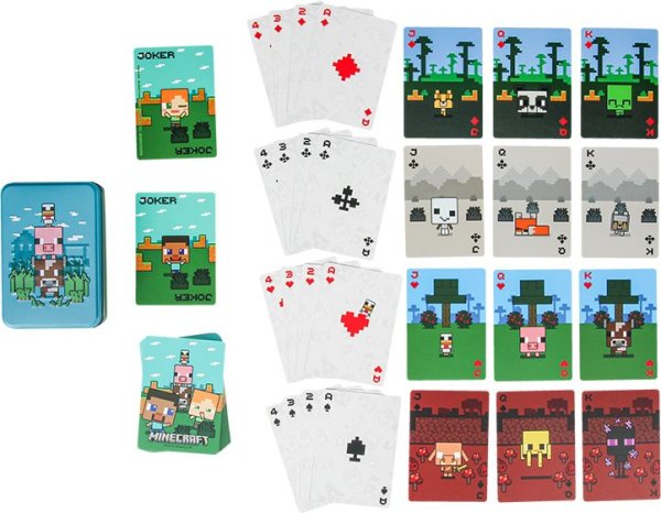 Hrací karty s motivem Minecraft zvířat. Karty jsou uloženy v dekorativní plechové krabičce, takže jsou ideální pro fanoušky nebo hráče. Vhodné pro hraní kvarteta, rummy, blackjacku, pokeru, černého Petra nebo pasiánsu. Balení obsahuje: 54 karet, včetně 2 žolíků Vhodné pro děti od 6 let.