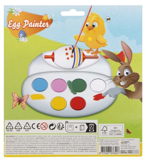 Paleta na malování vajíček + držák – do držáku upnete vajíčko a vodovými barvami namalujete dle své fantazie. Balení obsahuje držák na vajíčka, 6 vodových barev a štětec.