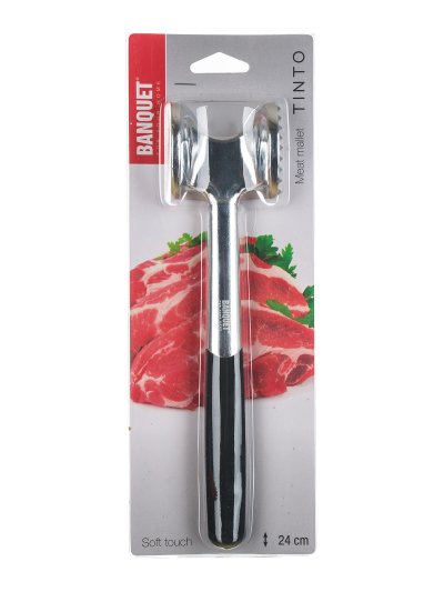 Oboustranná palička na maso TINTO je vhodná pro naklepávání všech druhů masa. Palička je vyrobena z hliníku. Rukojeť je ze speciálního plastu, který má protiskluzovou úpravu. Výrobek není vhodný do myčky nádobí.