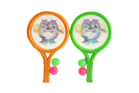 2 plastové pálky o délce cca 28 cm s platovým vnitřkem,na kterém jsou motivy delfínů.Součástí balení 2 plastové míčky cca 3 cm.věk 3+