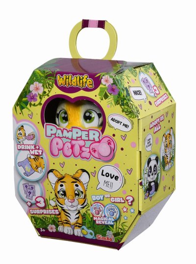 Roztomilé tygří koťátko s picí a čůrací funkcí, plenka s funkcí změny zbarvení po namočení, magická tlapka (po navlhčení se vybarví a ukáže pohlaví koťátka), adopční list a tři překvapení. Velikost 15 cm.