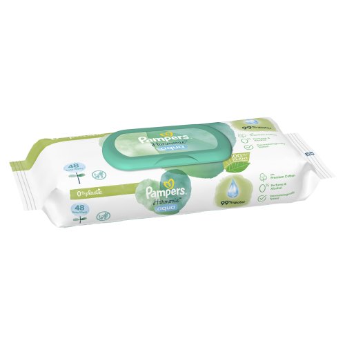 Pokožka novorozenců je velmi citlivá a zaslouží si šetrnou ochranu již při výměně plenky. Dětské čisticí ubrousky Pampers Harmonie Aqua obsahují 99 % vody pro úplnou ochranu pokožky. Obsahují 0 % plastů a jsou vyrobené z prémiové bavlny: 100% rostlinná vlákna. Jedinečné složení je dermatologicky testované a chrání pokožku lépe než vodou navlhčená bavlněná látka, aby jemně čistily i tu nejcitlivější pokožku a chránily ji před podrážděním. Protože jsou čisticí ubrousky Pampers Harmonie Aqua navržené s ohledem na citlivou pokožku novorozenců, jsou bez alkoholu, parfemace a barviv.
