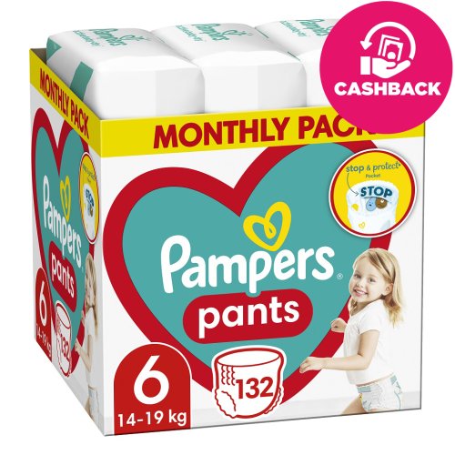 Velikost 6 132 kusů 13 - 19kg Poskytují trojnásobnou ochranu se systémem Stop & Protect 2× širší manžetky, které pomáhají předcházet protečení po stranách Kapsa, která pomáhá předcházet protečení vzadu Komfortní ochrana 360° Kapsa Stop & Protect pomáhá zabránit protečení vzadu Ochrana 360° se přizpůsobí tělíčku vašeho děťátka při každém pohybu Se super absorpčním jádrem, které okamžitě absorbuje tekutinu Snadná výměna plenkových kalhotek Jsou schválené dermatology z organizace Skin Health Alliance jako bezpečné při kontaktu s dětskou pokožkou Používejte společně s dětskými čisticími ubrousky Pampers