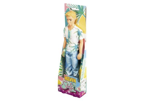 Panáček Kevin v prázdninovém outfitu. Oblečený v tričku s palmou a cool džínách se slunečními brýlemi. Velikost panáčka 30 cm.