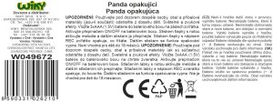 Panda opakující svítící 21cm. Baterie 3xAAA nejsou součástí. Stisknutím tlapky s notou hraje písničky. Další stisknutím písničku vypne, další stisknutí spustí další písničku. Celkem 5 různých písniček. Stisknutím tlapky s nápisem REC nahraje zvuk, který okamžitě zopakuje. Dalším stisknutím se opakování a nahrávání vypne. Baterie jsou umístěny na zádech zvířátka za suchým zipem. Přepínač on/off je umístěn na krabičce na baterie. Vždy když je zapnuto nahrávání, nebo písničky, bliká zvířátko barevně.