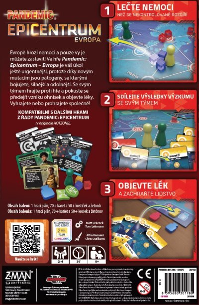 Ve hře Pandemic: Epicentrum - Evropa se stanete členy speciálního týmu, který bojuje proti nemocem. Použijte své jedinečné schopnosti, spolupracujte, zastavte šíření nemocí napříč Evropou a při tom pracujte na vývoji léků. Se svým týmem hrajte proti hře a pokuste se předejít vzniku ohnisek. Vyhrajete nebo prohrajete společně!