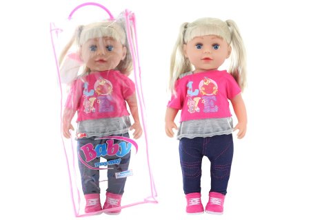 Panenka blondýnka oblečená do růžovo-šedého trička, kalhot a botiček. Oblečení lze sundat, je na suchý zip. Panenka má tvrdé plastové tělíčko a kloubové nohy. Součástí balení je také lahvička pro panenku. Rozměry panenky cca 45 x 18 x 7 cm. Rozměry balení cca 19 x 50 x 9 cm. Baleno v isáčku. Věk 3+