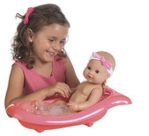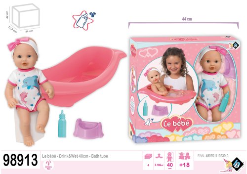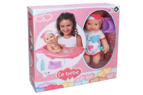 Panenka čurající set s vaničkou. Velikost vaničky 41cm. Obsahuje panenku, lahvičku, nočník, vaničku. Panenka má pohyblivou hlavu a končetiny. Při položení na záda zavře oči.