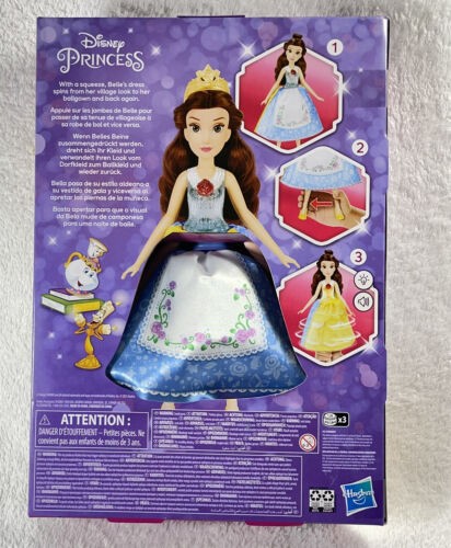Princezna Belle s měnícími šaty! Stlač jí nohy a sleduj, jak se jí zázračně změní šaty! Vydává zvukové efekty. Potřebné baterie 3× 1,5V A76/LR44 (jsou součástí balení).