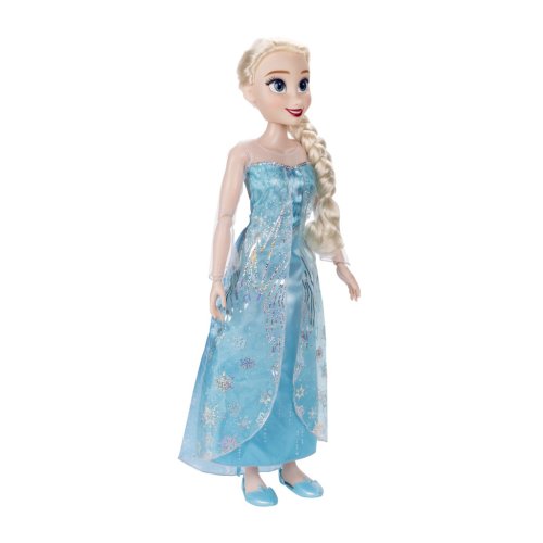 Panenka Disney Princezna Elsa 86 cm – panenka má krásné šaty a dlouhé spletené vlasy. Součástí jsou i dvě sponky do vlasů, dva hřebínky do vlasů, kartáč na vlasy, dvě sponky do vlasů, návod na různé účesy a vločkovou girlandu. Panenka je plně kloubová, takže je dokonale pohyblivá.