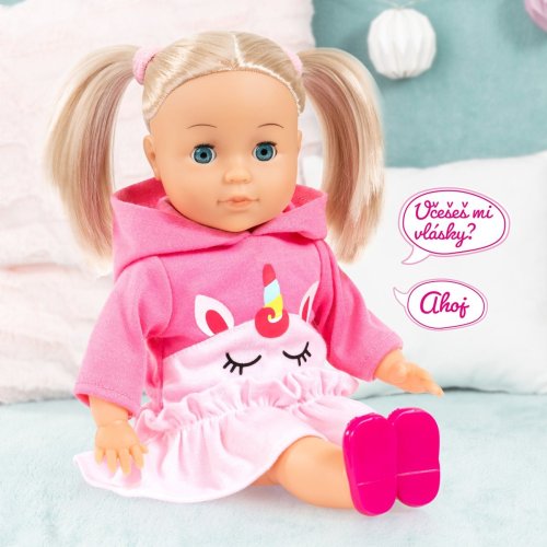 Krásná panenka s dlouhými blond vlasy a půvabnou tváří. Mluví česky – po zmáčknutí bříška mluví, zpívá a recituje až 100 vět. Měkké tělíčko – vhodné k mazlení, objímání i hraní. Zavírá oči – když nadejde čas spánku, Emma se uloží ke spánku spolu s dítětem. Součástí balení je hřeben a sponky – děti mohou vytvářet krásné účesy a rozvíjet svou kreativitu. Pro provoz jsou potřeba 2ks baterie typu AAA (jsou součástí balení).