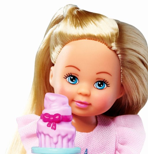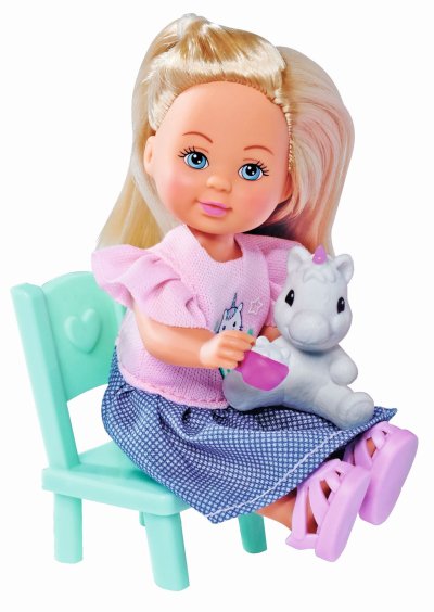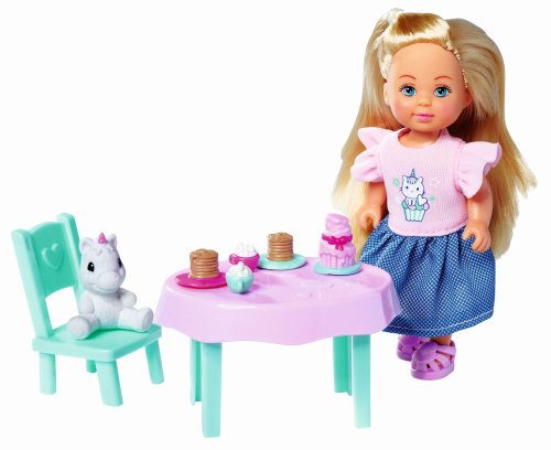Panenka Evička a její mazlíček, součástí stoleček se židličkou, káva a zákusky. Velikost panenky 12 cm.