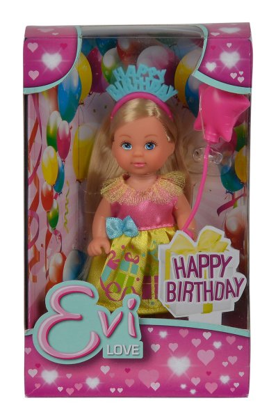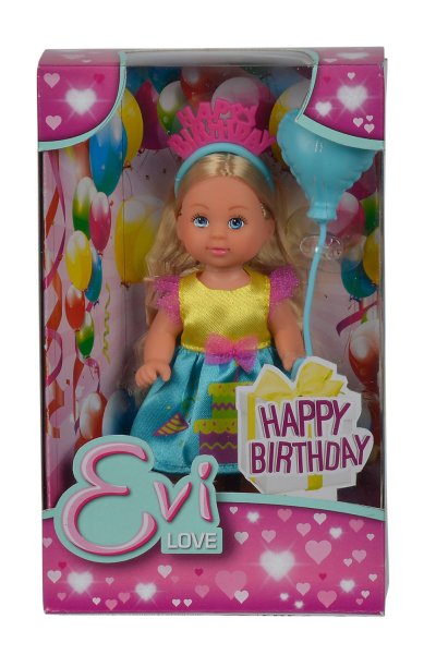 Panenka Evička v nádherných šatičkách a s korunkou na hlavě slaví své narozeniny. Nesmí chybět ani balónek. 2 druhy. Výška panenky 12 cm.