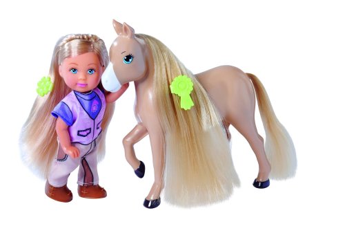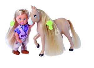 Panenka Evička s kočárem taženým jedním koněm, tajná přihrádka a příslušenství součástí. Délka povozu 28 cm. Výška panenky 12 cm.