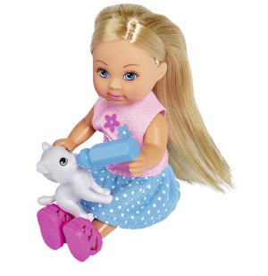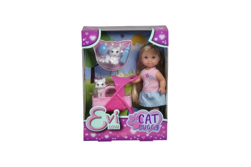 Panenka Evička se 2 roztomilými kočičkami a kočárkem s odnímatelným košíkem a doplňky. Velikost panenky 12 cm.