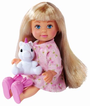 Panenka Evička s vysokou postelí, pracovním stolem, šatní skříní a dalším příslušenstvím. Výška panenky 12 cm.