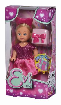 Panenka Evička v roztomilých třpytivých šatech s mašlí. Součástí je krabička s překvapením, ve které je štěňátko. Velikost panenky 12 cm.