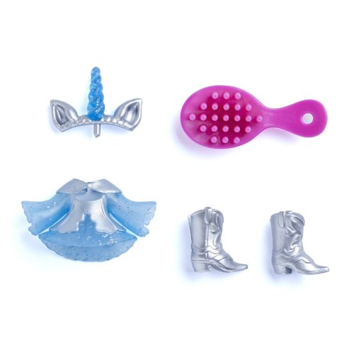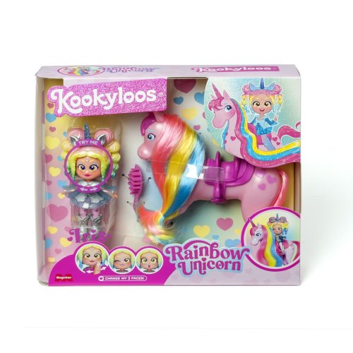 Věříte na jednorožce? Ve světě KookyLoos je všechno možné Objevte Auroru a jejího duhového jednorožce jménem Star, jehož hříva je vyrobena z pravých vlasů! Rozčešte je kartáčem a vyzkoušejte různé styly. Připravte se na tisíce dobrodružství s KookyLoos Nezapomeňte, že každý KookyLoos má své vlastní příslušenství, které můžete kombinovat a vyměňovat s ostatními KookyLoos, a měnit jejich obličeje jediným kliknutím. Sada obsahuje: 1 panenku, 1 jednorožce, 1 kartáč, 1 oblečení.