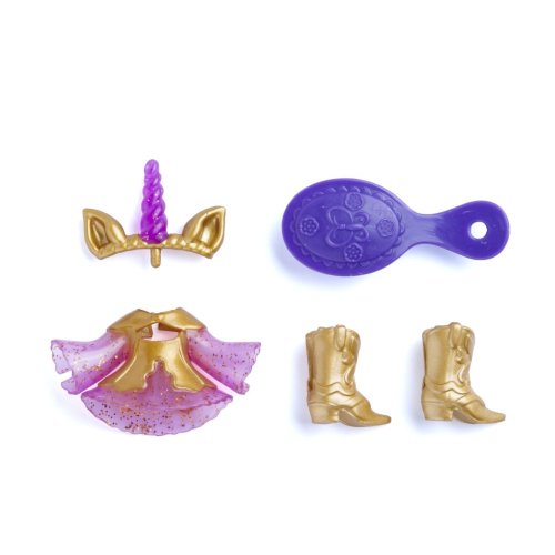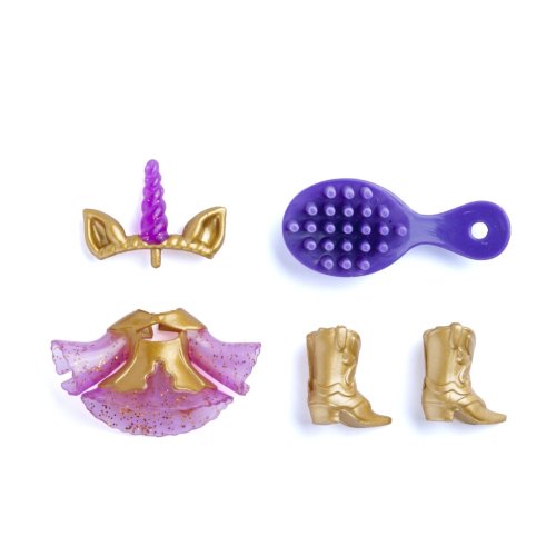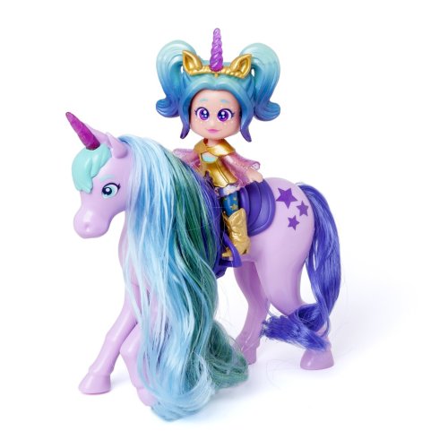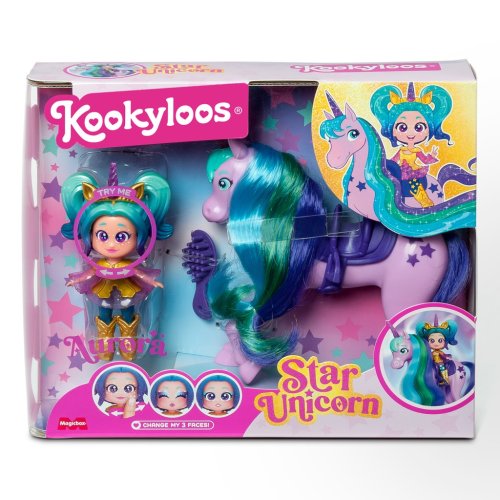 Věříte na jednorožce? Ve světě KookyLoos je všechno možné Objevte Auroru a jejího hvězdného jednorožce jménem Star, jehož hříva je vyrobena z pravých vlasů! Rozčešte je kartáčem a vyzkoušejte různé styly. Připravte se na tisíce dobrodružství s KookyLoos Nezapomeňte, že každý KookyLoos má své vlastní příslušenství, které můžete kombinovat a vyměňovat s ostatními KookyLoos, a měnit jejich obličeje jediným kliknutím. Sada obsahuje: 1 panenku, 1 jednorožce, 1 kartáč, 1 oblečení.