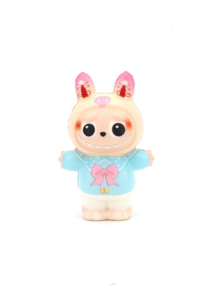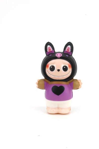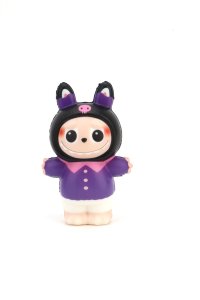 Panenka mačkací o velikosti 12 cm je navržena jako měkká a pružná hračka, která je ideální pro mačkání a uvolnění stresu. Panenka má kulatý obličej s velkýma očima a výrazným úsměvem, což jí dodává přátelský a hravý výraz. Každá panenka je oblečena do stylizované kombinézy s kapucí, která má uši připomínající zvířecí motiv, například králičí uši. Kapuce je zdobena detaily jako jsou hvězdičky, lebka nebo mašličky, což přispívá k originálnímu vzhledu každé panenky.