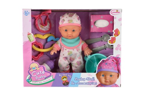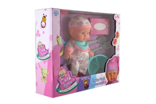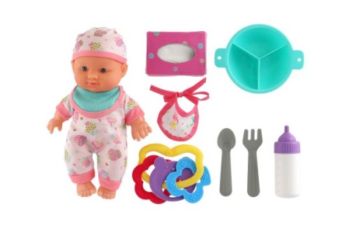 Roztomilá panenka s pevným telíčkem. Toto miminko udělá jistě radost každé holčičce a stane se tak její nepostradatelnou součástí. Součástí balení je lahvička, chrastítko, obrousky a jídelní set pro batolata, které určitě každá maminka pro své miminko nutně potřebuje. Velikost panenky: 22 cm Rozměr balení: 30 x 24 x 8 cm. Vhodné pro děti od 3 let.