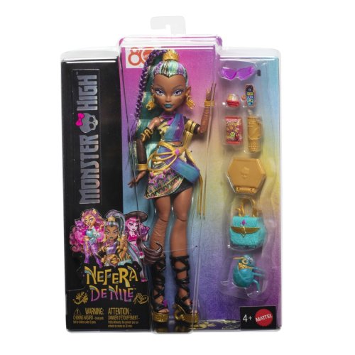 Seznamte se s Neferou de Nile, dcerou Múmie a starší sestrou Cleo de Nile. Nefera je královská, sebevědomá a miluje být středem pozornosti. Její styl je inspirován egyptskými klenoty a má typicky tyrkysové vlasy s černými a zlatými melíry.Nefera je oblečená do stylového, mumii inspirovaného oblečku s tyrkysovými a zlatými detaily, které zdůrazňují její status.Její vzhled doplňují šperky, jako jsou ikonické náušnice a doplňky s motivem hadů.Panenka má kloubové spoje pro dynamické a kreativní pózování při hře.