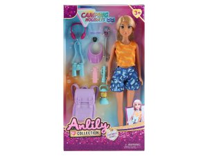 Panenka Anlily v sadě Camping holiday s doplňky. Panenka má na sobě kraťasy a top. Doplňky: foťák, kabelka, sluchátka, sluneční brýle, náhrdelník a žabky. Výška panenky: 30 cm. Rozměry balení: 32 x 18 x 5 cm. Věk: 3+