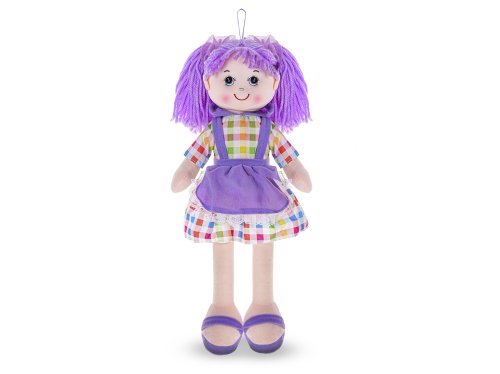 Látková panenka potěší každou holčičku. Má měkké tělíčko, proto je vhodná i pro nejmenší. Panenka umí mluvit a zpívat v češtině: "Halí, belí…", "Travička zelená...", "Pásla ovečky v zeleném háječku…". Fialová panenka Nanynka má 50 cm. Vhodné pro děti od narození.