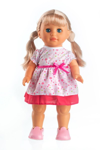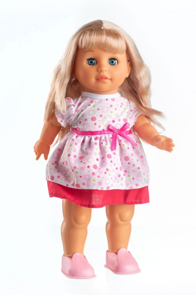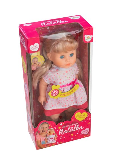 Chodiaci a hovoriaci bábika Natálka má krásne dlhé vlásky, ktoré dievčatká môžu česať a vyrábať najrôznejšie veselé účesy. Po stlačení tlačidla na brušku začne bábika chodiť a spievať: "Ahoj, ja som Natálka. Zaspievame si spolu? ... Maličká som..., Zlatá brána otvorená ..., Spievanky spievanky... Na batérie - 3 ks typu AA 1,5 - batérie sú súčasťou výrobku Rozmer bábiky: 42 cm Rozmer krabice: 21 x 44 x 11 cm Vhodné pre deti od 3 rokov.