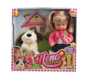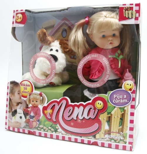 Panenka Nena je skvělá interaktivní hračka pro děti, které si chtějí hrát na maminku a starat se o své miminko. Panenka o velikosti 36 cm umí říct až 50 slov, což ji činí zábavnou a realistickou. Nena pije z lahvičky a dokáže také čůrat, což přidává na realističnosti hry. Součástí balení je kromě panenky také roztomilý pejsek a lahvička na pití, díky čemuž si děti mohou vymýšlet různé příběhy a situace, které budou obohacené o nové zážitky a radostné chvíle.