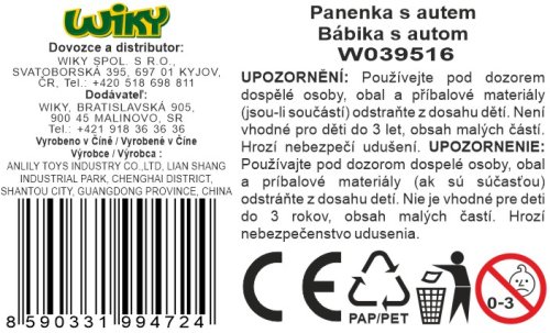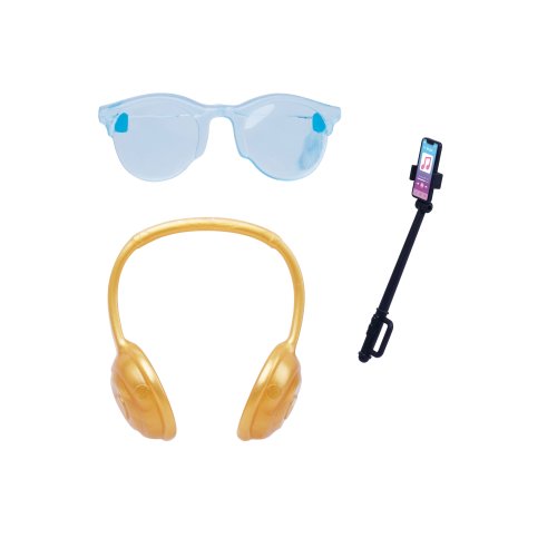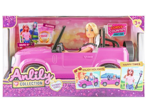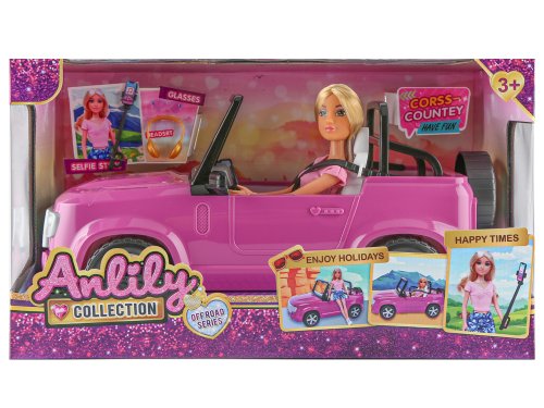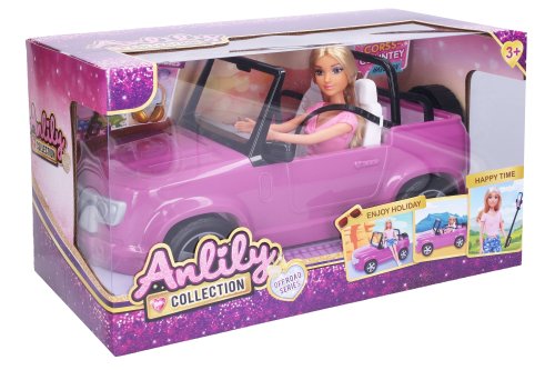 Panenka s autem. Velikost panenky 30 cm. Součástí auto, selfie tyč a sluchátka.