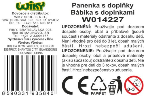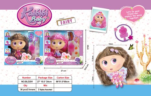 Panenka s doplňky. Velikost 18 cm. Součástí hřeben, 2 sponky, motýlek do vlasů. 2 varianty - hnědé, růžové vlasy.