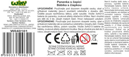 Panenka s kabelkou, čepicí a zvukovými efekty. Velikost 36 cm. Zvukové efekty stiskem bříška. 3xAG13 baterie součástí. Součástí hřeben a kabelka.
