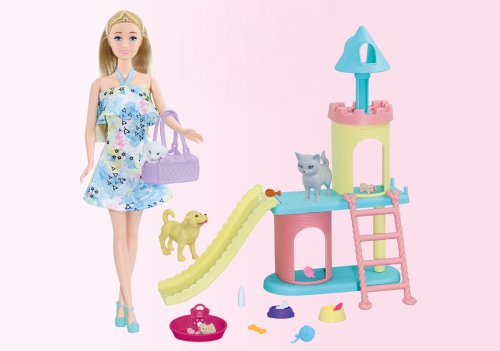 Panenka se zvířátky. Velikost panenky 30 cm. Obsahuje panenku, pejsky, štěňátka, kočku, hračky a příslušenství pro zvířátka, domeček pro zvířátka.