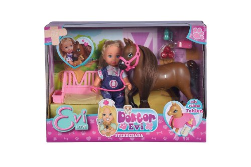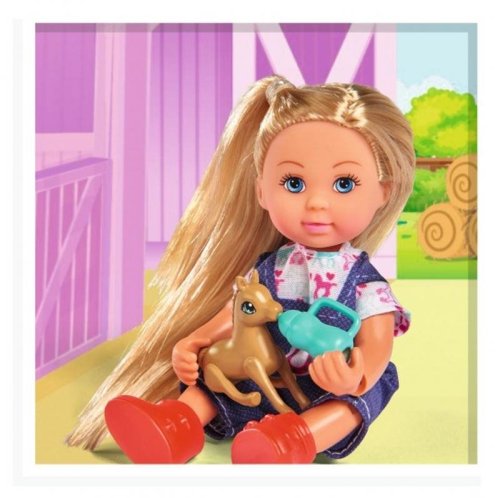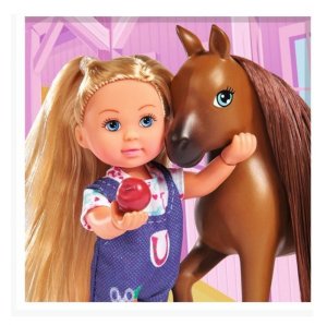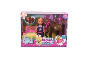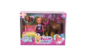 Panenka Evička Veterinářka pomáhá na svět hříbátku. S klisnou, hříbátkem, pelíškem pro hříbátko a příslušenstvím. Velikost panenky 12 cm.
