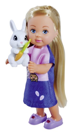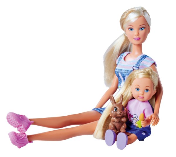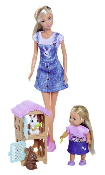 Panenka Steffi s Evičkou a králičí rodinkou. Součástí jsou 2 králíci, mrkve, králíkárna. Velikost panenky Steffi 29 cm, Evička 12 cm.