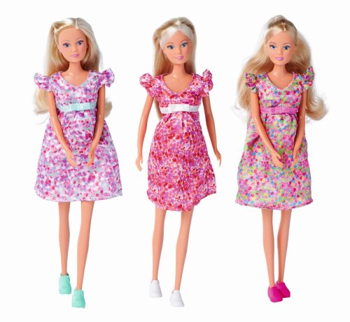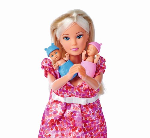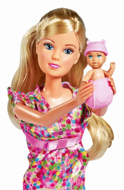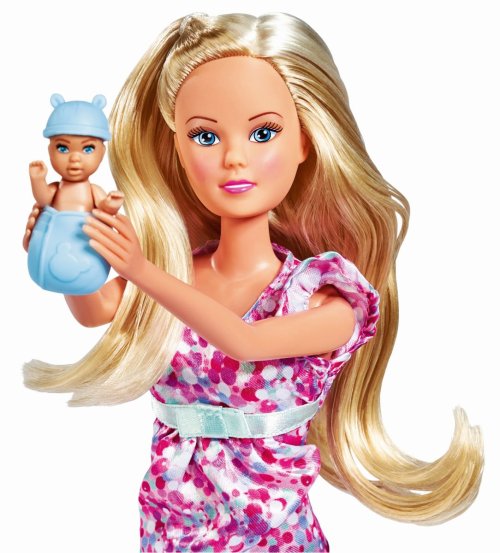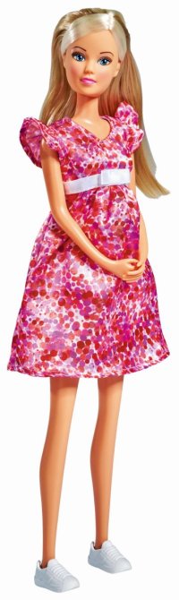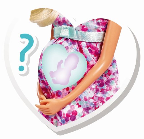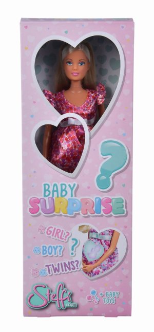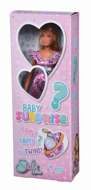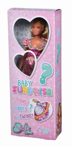Těhotná panenka Steffi s dítětem jako překvapení a s více než 11 doplňky. Bude to chlapeček, holčička nebo dvojčátka? Velikost panenky 29 cm. 3 druhy.
