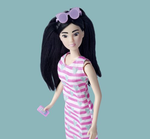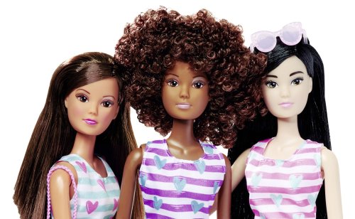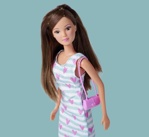 Panenka Steffi v pruhovaných šatech se srdíčky, různé barvy. 3 různé panenky, kamarádky. Velikost panenky 29 cm.