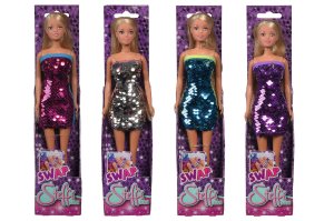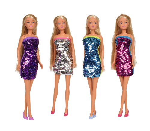 Panenka Steffi v šatech z barevných flitrů se swap efektem. Velikost 29 cm.