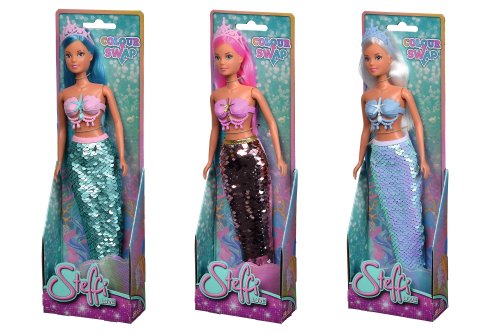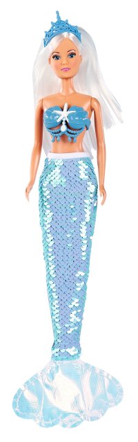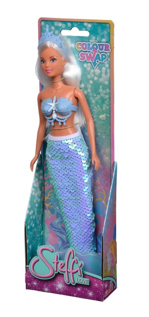 Panenka Steffi jako mořská panna s ploutví z barevných flitrů se swap efektem. Velikost panenky 29 cm.
