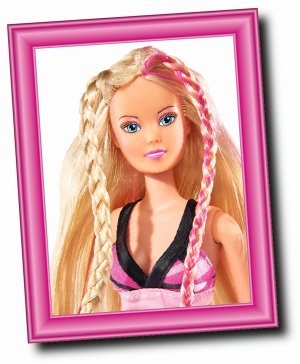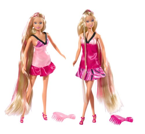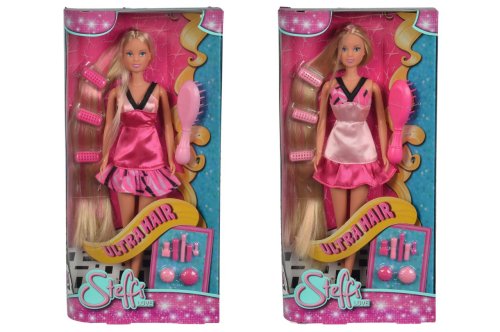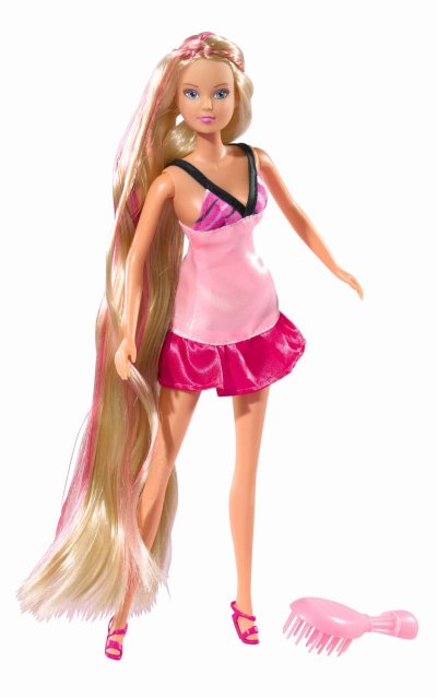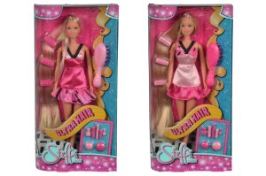 Panenka Steffi s extra dlouhými vlasy s hřebenem, kartáčem, fénem a kulmou. Výška panenky 29 cm.