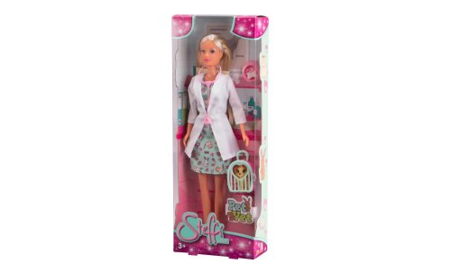 Panenka Steffi jako veterinářka se stará o pejska. Součástí balení je přepravka, miska pro psa a kostička. Velikost panenky 29 cm.