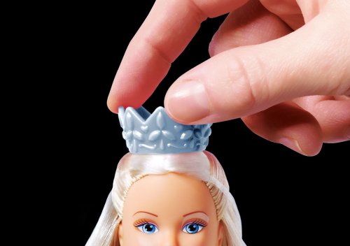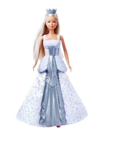 Panenka Steffi ve svatebních šatech. Otočením korunky na hlavě změníš šaty z bílých na růžové a naopak. Výška panenky 29 cm.