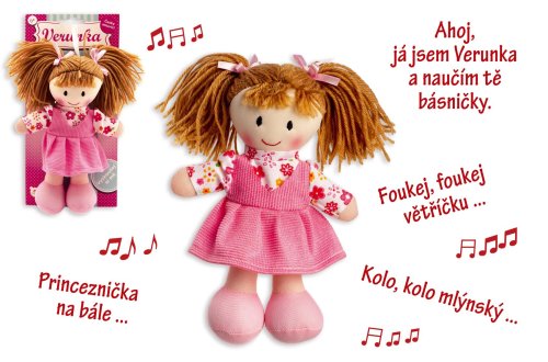 Hadrová panenka Verunka po zmáčknutí bříška povídá: "Ahoj, já jsem Verunka a naučím tě básničky" a říká básničky: "Princeznička na bále..., Foukej, foukej větříčku..., Kolo, kolo mlýnský..." Rozměr: 20 cm Vhodná pro děti od 0 let Výrobek obsahuje nevyměnitelné baterie.