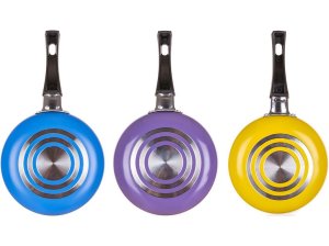 Mini pánev NATURA 14 x 3 cm, nepřilnavý povrch v černé barvě. Vnější povrch mix barev: modrá, fialová, žlutá. Bakelitová rukojeť, spirálové dno. Pánev lze používat na všechny typy varných desek mimo indukce.