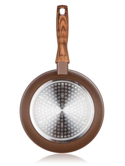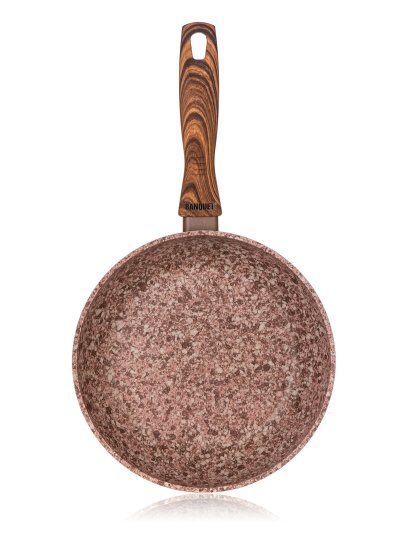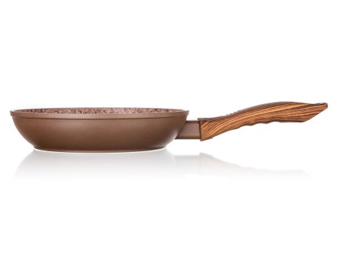 Pánev s nepřilnavým povrchem SMART STONE Brick. Kovaná hliníková pánev SMART STONE BRICK s bakelitovou rukojetí se soft touch povrchovou úpravou v imitaci přírodního dřeva. Pánev má dvouvrstvý vnitřní nepřilnavý povrch ve struktuře říčního kamene, indukční dno a je opatřena vnějším žáruvzdorným nástřikem.