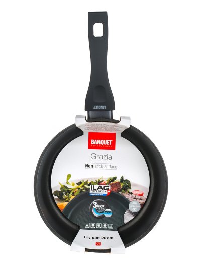 Hliníková kovaná pánev GRAZIA se značkovým nepřílnavým 3vrstvým povrchem ILAG PREMIUM. Vnější 2vrstvý žáruvzdorný nástřik. Indukční dno s piktogramovým laserovým potiskem.