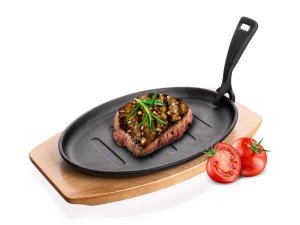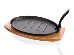 Litinová pánev na dřevěném prkénku, pánev má odnímatelné litinové držadlo na vyndávání pánve z trouby. Pánev je vhodná pro zapékání pokrmů, lze jí použít pro přímé servírování, dřevěné prkénko slouží jako podložka pod horkou pánev.